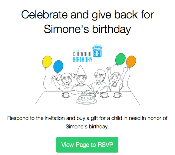 We discovered that through CommuniGift’s interface, rather than having our guests bring presents to her party, we could invite them to donate gifts to her virtual “birthday buddy” instead. In the face of birthday consumerism, CommuniGift was an opportunity to buffer what was already enough celebration for one three-year-old. Simone could share the joy and magic of birthdays with other kids, who otherwise might not have the chance to celebrate their birthday this year.